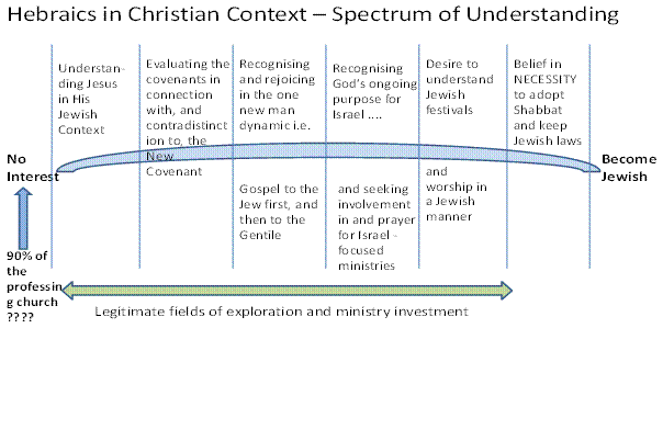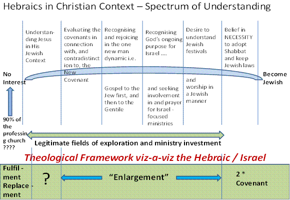 On the basis that entire research theses and numerous books have been written on these two subjects, this essay is not the place to resolve them, but it is important that those who see themselves as part of the Hebraic Church initiative, are clear about where we stand. Replacement Theology and Two-Covenant Theology are unscriptural, defy the clear teachings of Jesus and the progressive revelation of Scripture and specifically ignore the key teaching of Apostle Paul in Romans chapters 9 thru 11. By the same token "Judaising" the church, or any desire to seek peace through Torah observance is equally to be rejected (see Galatians chapter 5). So where do (most) in the Hebraic Church initiative actually stand on these issues? I would suggest that where most "Hebraics" stand is clearly set out in the diagram below, which sees Hebraic understanding as a sort of continuum - and inevitably different people are in different places on that continuum. To the left of the diagram lies, definitively, Replacement Theology. To the right lies ever-bolder Judaising. Plainly most Hebraics seek a clear, identifiable, position between these two extremes.