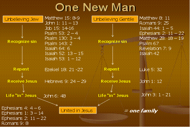 So what is the relationship between a Jew who chooses to follow Jesus and a non-Jew? Is there a different path to salvation? Absolutely not! Although the starting points of their journey to faith might be subtly different, their spiritual needs are identical, as the diagram below illustrates. Once again, we must observe that this short essay is not the place to permanently resolve this issue to the satisfaction of all. But the diagram below should, at least, indicate where Hebraics stand on this important question. Incidentally, the phrase one new man comes directly from Ephesians 2:14.